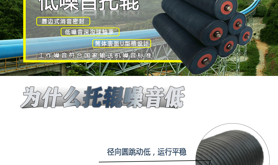 產品簡介: FJS-JY低噪音托輥,其管體選用優(yōu)質改性超高分子量聚乙烯(UHMW-PE)主材料,通過良好的生產加工工藝,使動平衡等級達到G16(ISO1940)標準,運行平穩(wěn),U型通風槽精細加工,減少與皮帶的摩擦。結合華北塑料公司自主研發(fā)的唇邊式消音密封,使帶式輸送機的噪音降到(達到)國家標準GB12348以下。